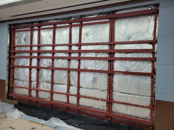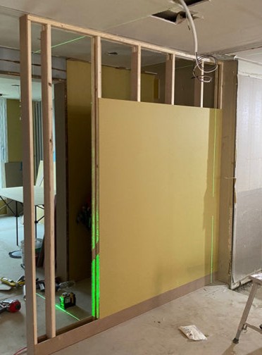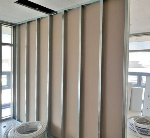 경량 칸막이는 이미 만들어진 벽체를 구입하여 시공하며 가장 외부가 석고판넬이며 그 안에 얇은 사각파이프가 뼈대를 구성합니다.
