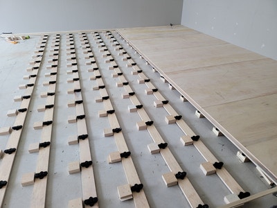 무용실 바닥은 콘크리트 바닥에서 위로 띄어서 무용 특수 바닥을 설치합니다.